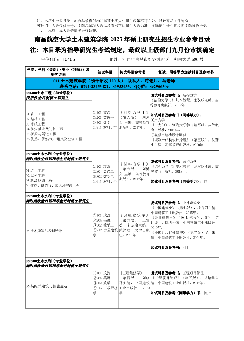 南昌航空大学土木建筑学院2023年硕士研究生招生专业参考目录20220426